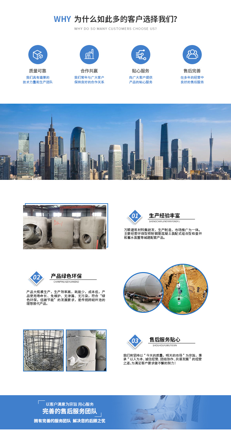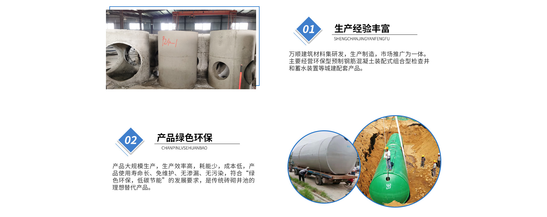黃山市萬順建筑科技有限公司是集研發(fā),生產(chǎn)制造,市場(chǎng)推廣為一體的綜合性企業(yè)。公司主要經(jīng)營環(huán)保型預(yù)制鋼筋混凝土裝配式組合型檢查井和蓄水裝置等城建配套產(chǎn)品。產(chǎn)品生產(chǎn)過程采用獨(dú)特的生產(chǎn)工藝,機(jī)械化流水作業(yè)。產(chǎn)品大規(guī)模生產(chǎn),生產(chǎn)效率高,耗能少,成本低,產(chǎn)品使用壽命長(zhǎng)、免維護(hù)、無滲漏、無污染,符合“綠色環(huán)保,低碳節(jié)能”的發(fā)展要求,是傳統(tǒng)磚砌井池的理想替代產(chǎn)品。